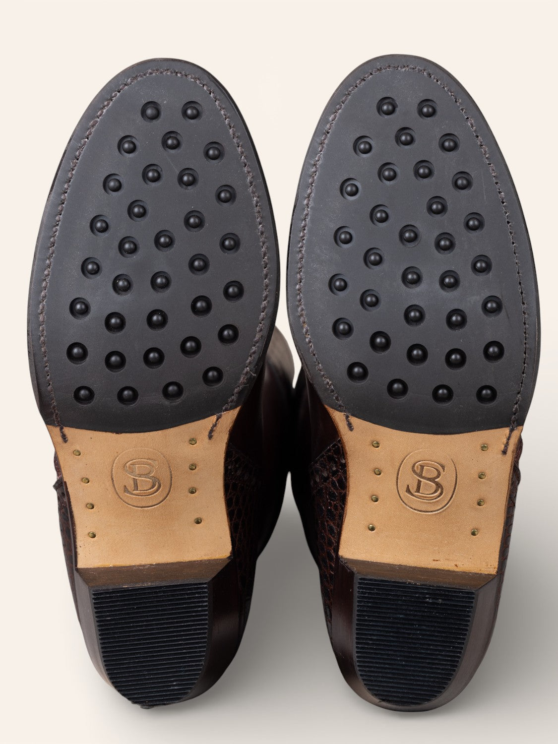- Goodyear welted leather sole with integral cork layer for a natural, breathable footbed supporting ergonomic and anatomical comfort